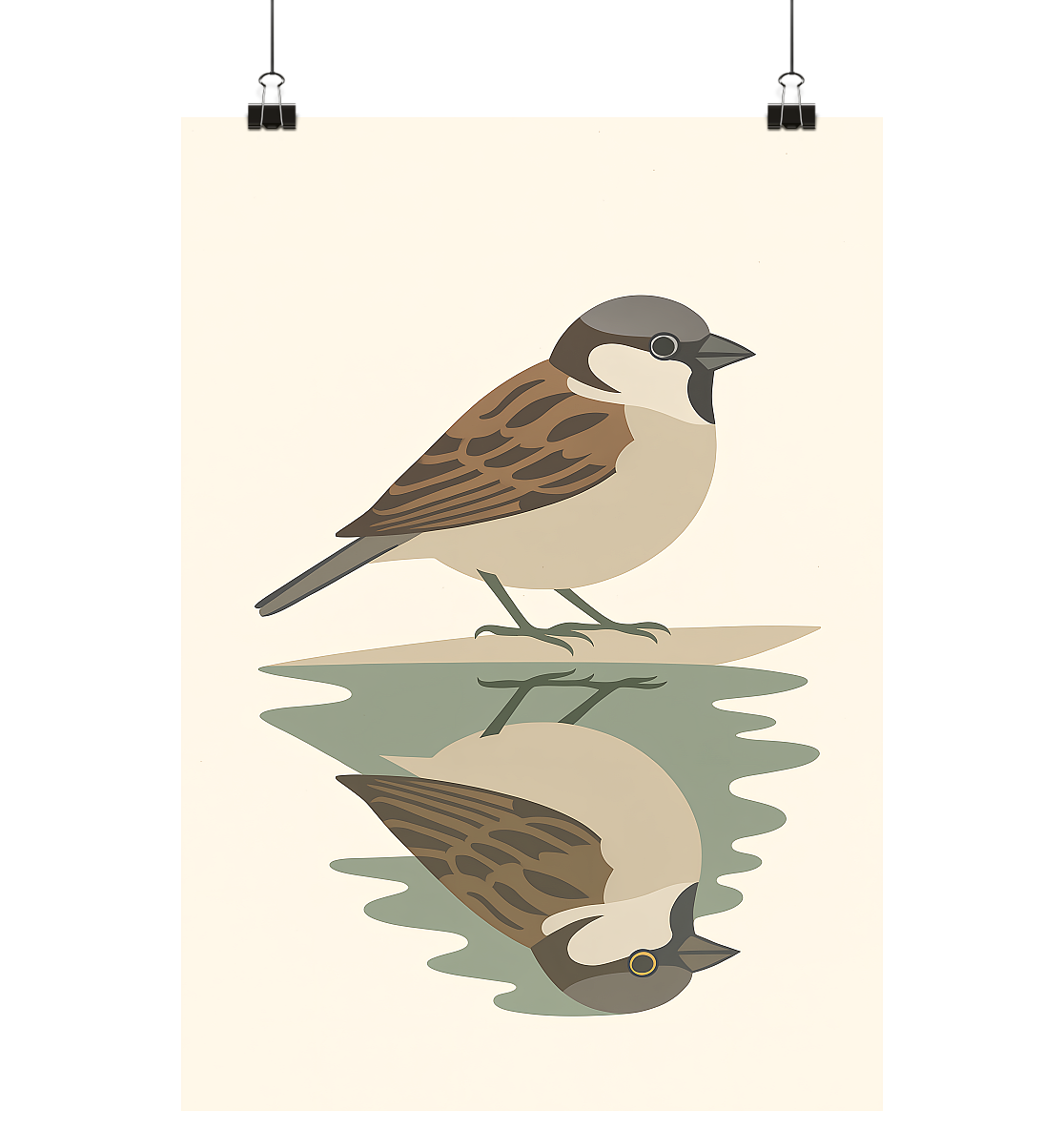 Entdecken Sie die Poesie der Natur – Der 'Pfützenspiegel – Haussperling' Poster bildet einen charmanten Haussperling ab, der sich in einer Pfütze spiegelt. Die klaren Linien und die harmonische Farbpalette aus gedeckten Braun- und Grüntönen schaffen ein Gefühl von Ruhe und Verbundenheit mit der Natur. Dieses Poster bringt die Schönheit der Natur direkt in Ihr Zuhause.